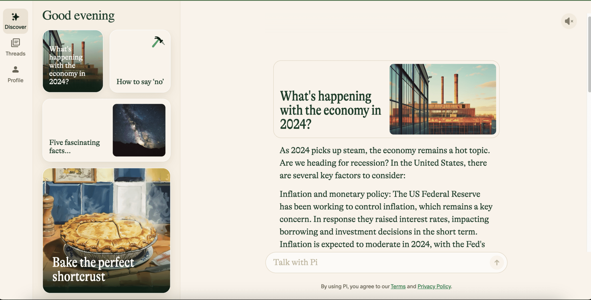 It aims to provide a supportive and empathetic user experience, with a design philosophy centered around being kind, curious, and creative. Pi's responses are crafted to be more personal and emotionally engaging, making it suitable for users seeking companionship or emotional support. However, this makes Pi's scope in handling in-depth informational requests or content generation more limited than ChatGPT's. This is due to constraints on input and output length and its focused approach on personal interaction rather than factual accuracy or content creation​​​​.