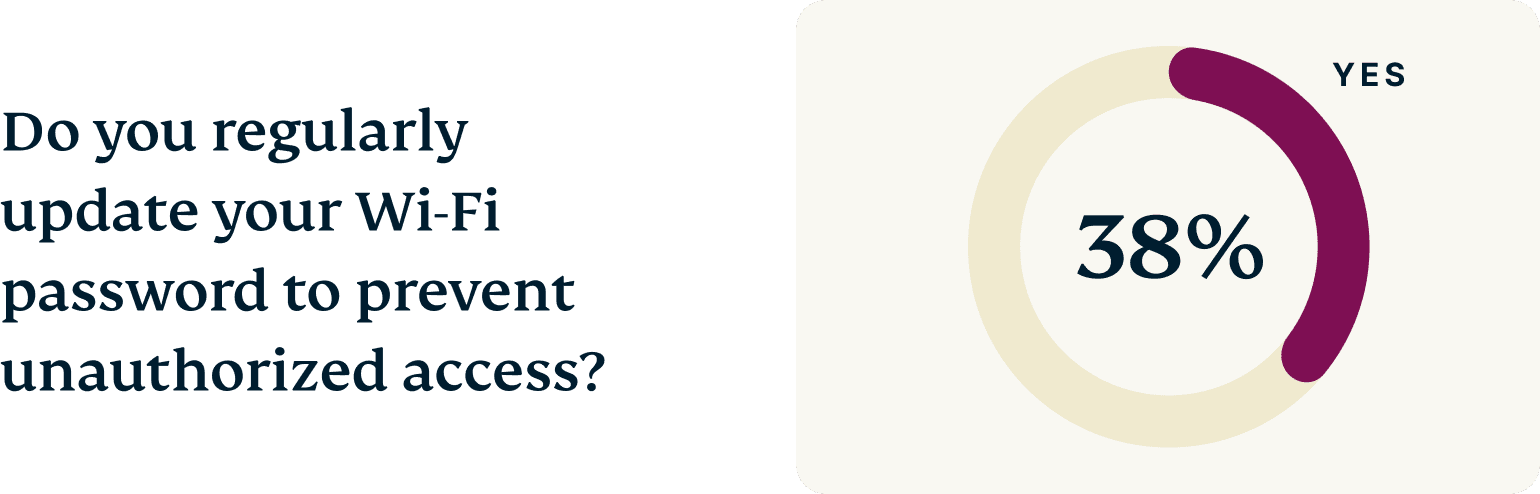 Our survey results reveal that a significant majority (94%) of respondents use passwords to protect their home Wi-Fi networks, which aligns with the common practice of setting up passwords during router installation. Furthermore, 38% of respondents admit to updating their passwords regularly. While this practice isn't necessary if you have a strong password saved in a password manager, it can prevent past Wi-Fi users from retaining access.