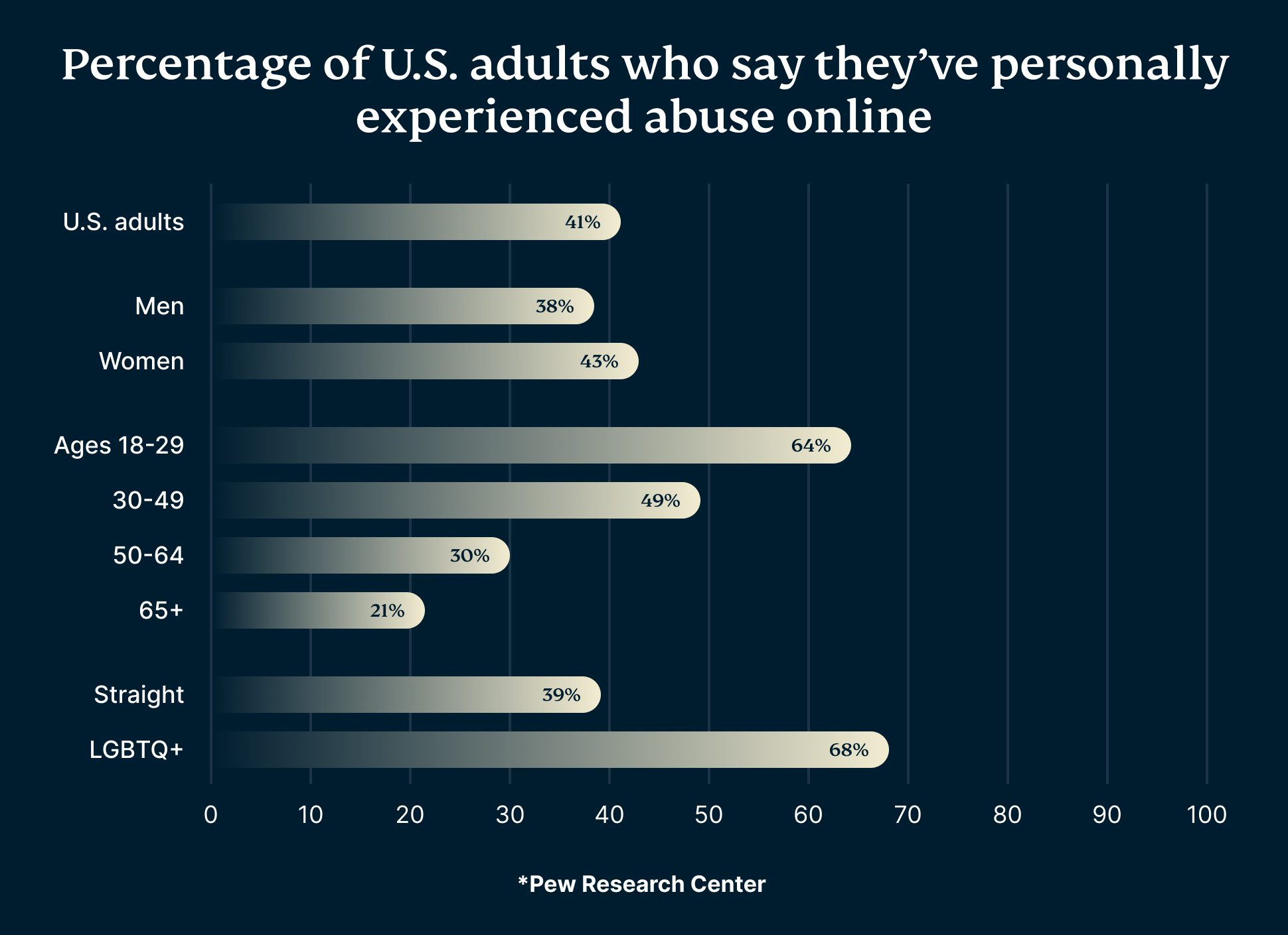 A Pew Research Center study found that as many as 4 in 10 internet users in the U.S. have experienced some form of online harassment, ranging from less severe instances such as name-calling to more invasive forms like stalking. Similarly, a Statista study revealed that 51% of Brits have faced cyberbullying, and 36% have been trolled online.