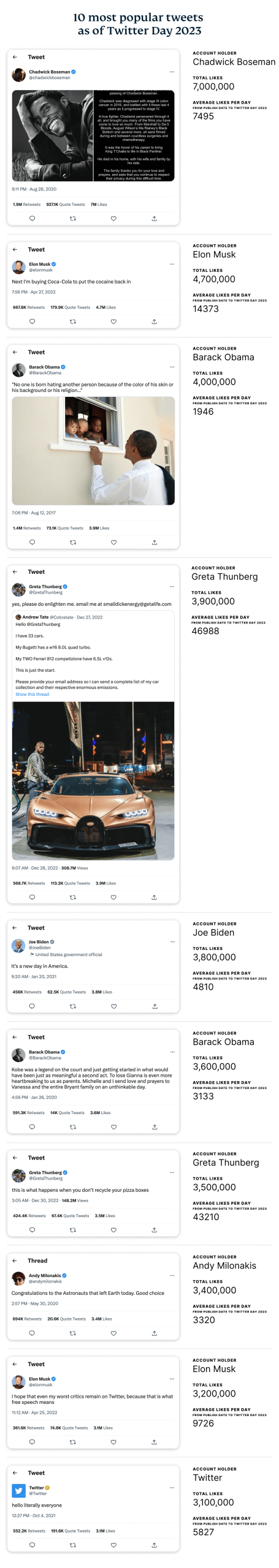 . - A post announcing the passing of Chadwick Boseman by the actor's family remains the most-liked tweet ahead of Twitter Day 2023