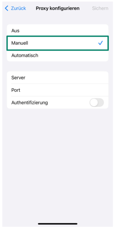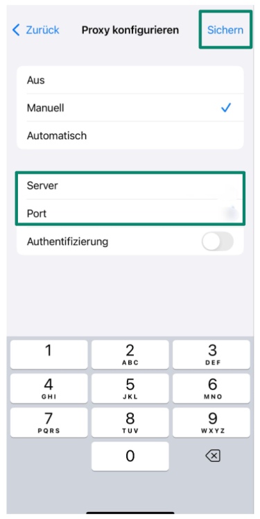 5. Geben Sie die Proxy-Server-Adresse sowie die Port-Nummer an, die Sie von Ihrem Service erhalten haben. Tippen Sie anschließend auf Speichern.