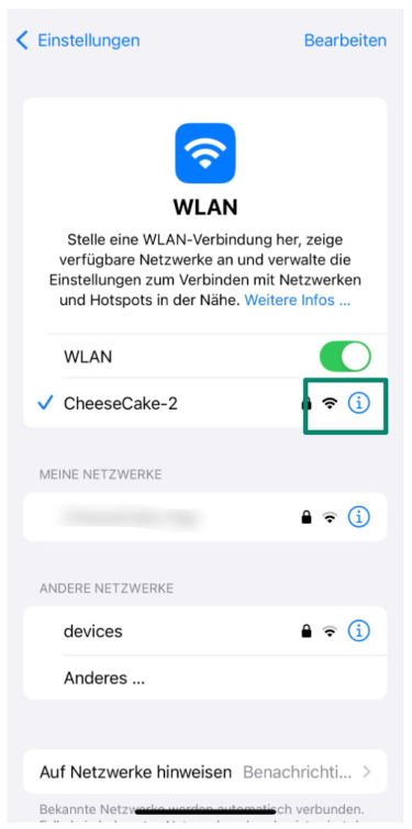 2. Finden Sie das Netzwerk, womit Sie verbunden sind und tippen dann auf das kleine Symbol (i) neben dem Namen Ihres Netzwerks.