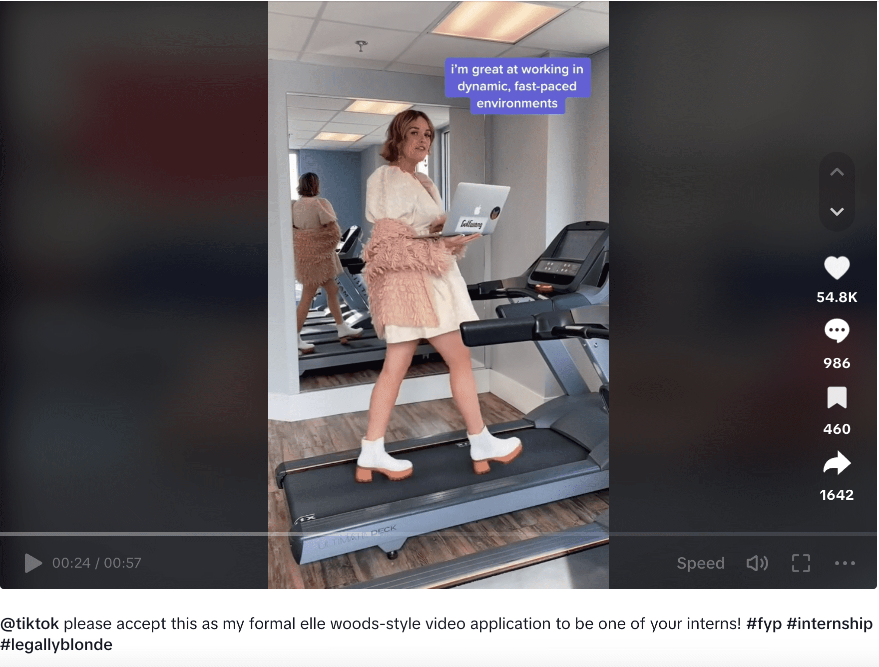 Kalli Roberts, 25, eine ehemalige Studentin der Brigham Young University in Utah, ist eine weitere Kandidatin, deren TikTok-Lebenslauf ihr einen Job verschaffte. Nachdem sie ihr von Legally Blonde inspiriertes Lebenslauf-Video veröffentlicht hatte, gelang es ihr, sich ein Praktikum bei TikTok selbst in der globalen Geschäftsabteilung zu sichern. „Ich kann gut in dynamischen, schnelllebigen Umgebungen arbeiten“, sagt sie, während sie auf einem Laufband läuft.