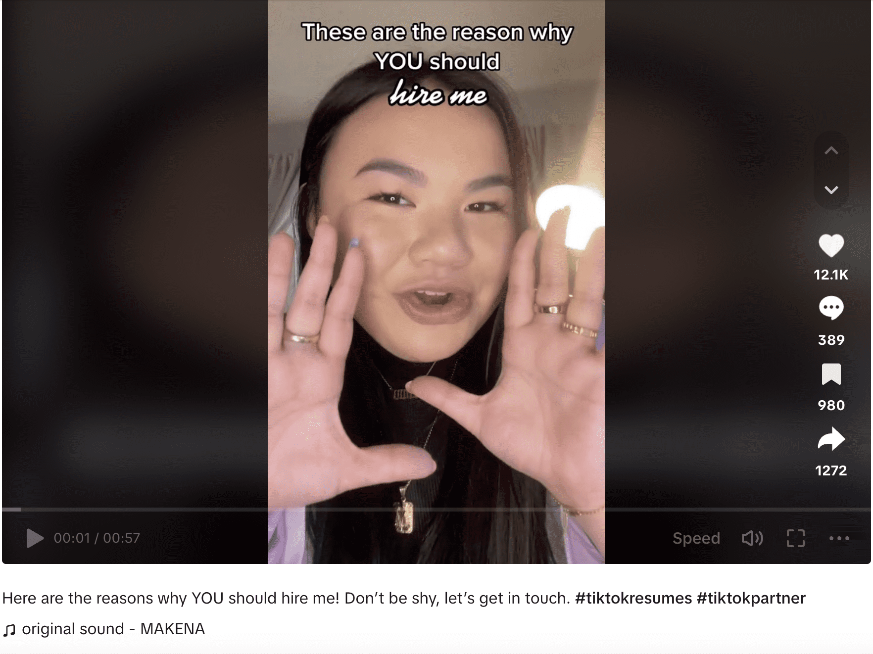 Diese neue Welle von Arbeitssuchenden greift häufig auf visuelle Medien, wie z. B. Video-Lebensläufe, zurück, um ihre Fähigkeiten zu präsentieren. Es überrascht nicht, dass die Plattform, auf der dies am häufigsten geschieht, TikTok ist.