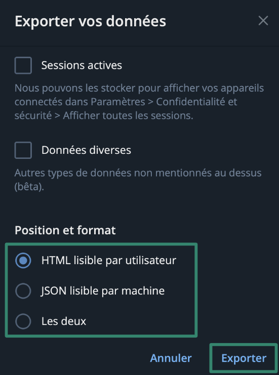 Avant de supprimer définitivement votre compte Telegram, il est judicieux d'exporter vos données, y compris vos discussions, vos médias et l'historique des groupes. N'oubliez pas que Telegram ne vous permet pas de restaurer ces données sur un nouveau compte. Une fois exportées, elles ne peuvent être utilisées qu'à des fins de sauvegarde.