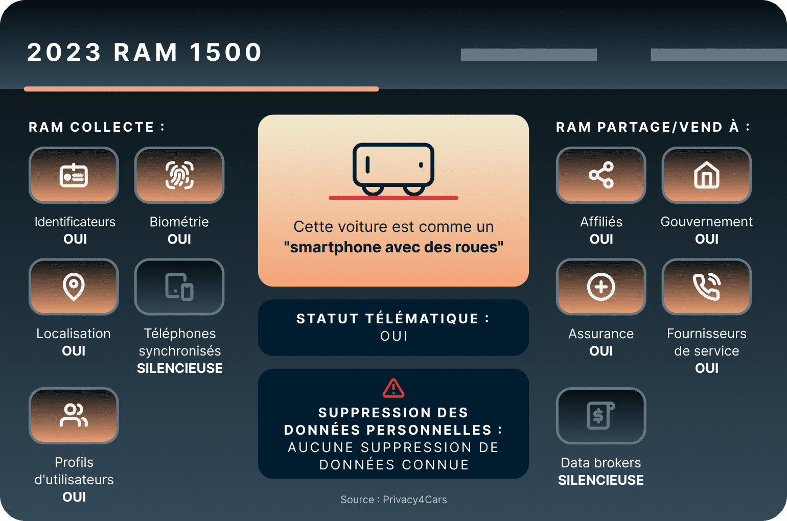 Le bon côté, c’est que RAM offre trois possibilités aux individus pour gérer leurs données personnelles dans la plupart de leurs nouvelles voitures. Cela inclut l’activation de la collecte de données de géolocalisation, l’engagement/désengagement sur l’utilisation spécifique de données à travers les canaux numériques, et la possibilité de faire une requête pour “les droits à l’oubli”.
