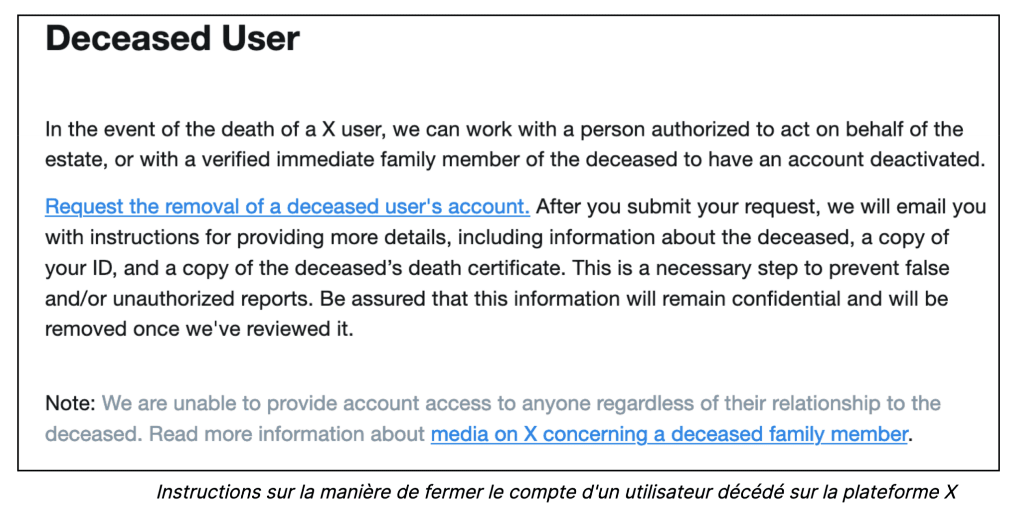 À l'heure où nous rédigeons ces lignes, X définit un compte comme inactif s'il n'a pas été utilisé au cours des 30 derniers jours, durcissant ainsi considérablement ses conditions par rapport au seuil précédent de six mois. Cette politique nécessite des connexions régulières pour qu'un compte soit considéré comme actif, ce qui pose un problème pour la préservation d'un héritage numérique sur la plateforme.