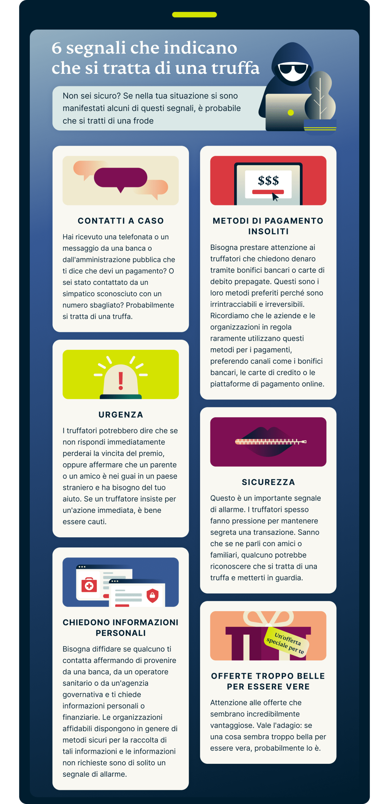 - Bonus: attenzione ai sei segnali di una truffa sicura.