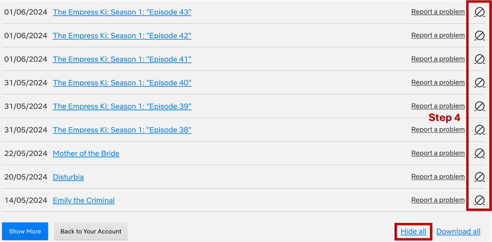 Azione irreversibile: Una volta nascosti gli elementi dalla cronologia di Netflix, non è più possibile recuperarli o rimuoverli. Assicurati di essere certi di voler rimuovere titoli specifici o l'intera cronologia prima di procedere.