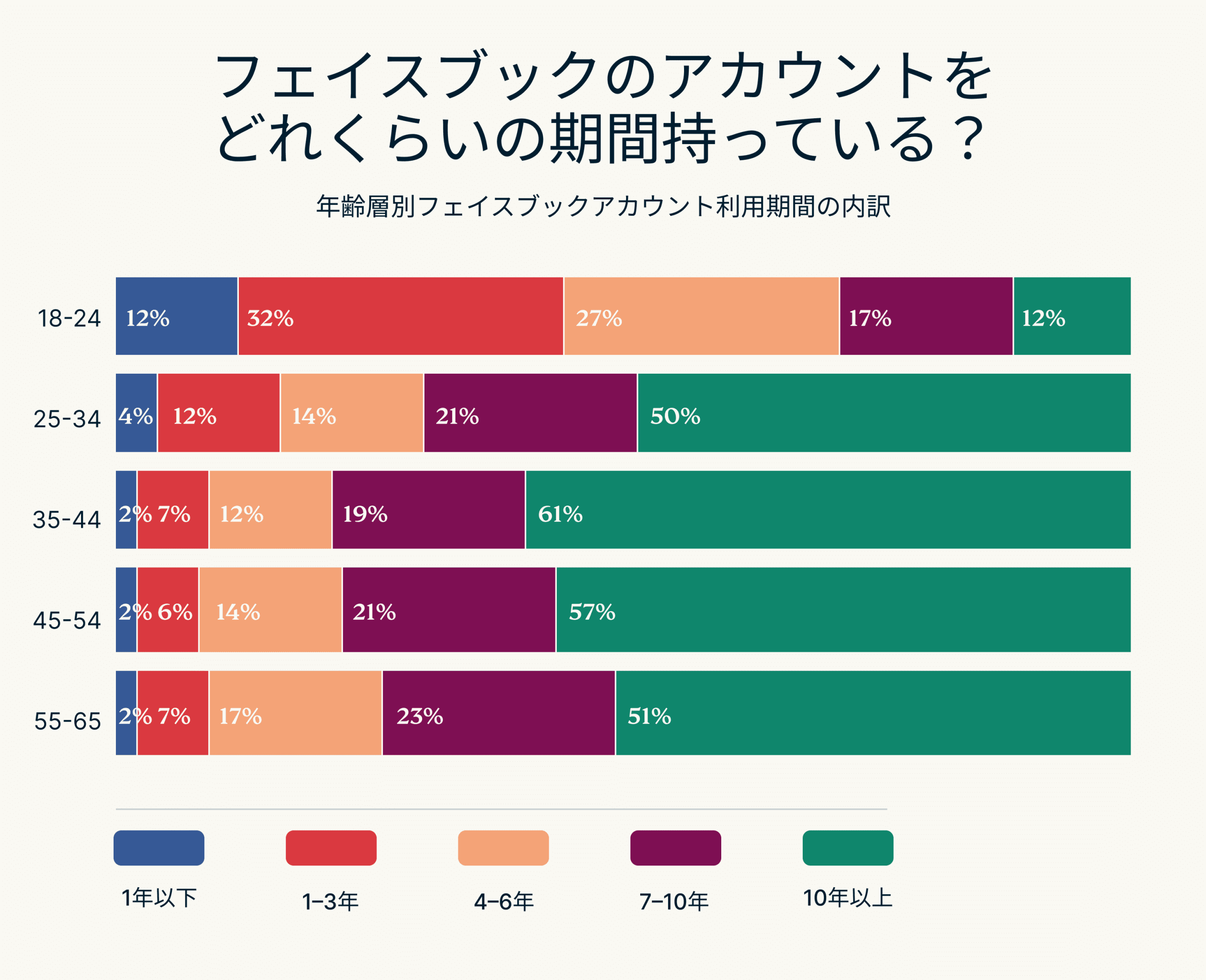 35〜44歳は最も利用歴が長い層で、72%がアクティブに利用し、61%が10年以上Facebookを使い続けている