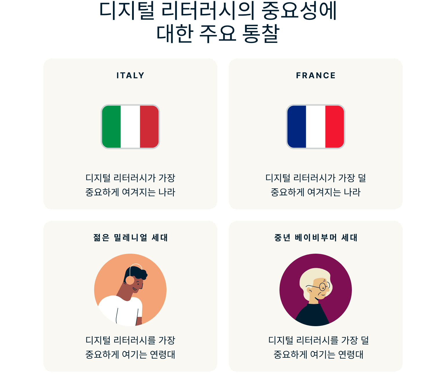마지막으로, 나이 든 베이비부머 세대에서는 명확한 분열이 나타납니다. 이탈리아에서는 여전히 40%가 디지털 문맹률의 중요성을 인식하고 있으며, 이 연령대의 상당 부분이 계속해서 정보를 유지할 필요성을 이해하고 있음을 보여줍니다. 그러나 프랑스와 스페인에서는 각각 17%와 25%의 응답자만이 이를 우선시하고 있습니다. 이는 디지털 세계와의 단절감이나 이러한 기술이 일상생활에서 덜 관련성이 있다고 믿는 것 때문일 수 있습니다.