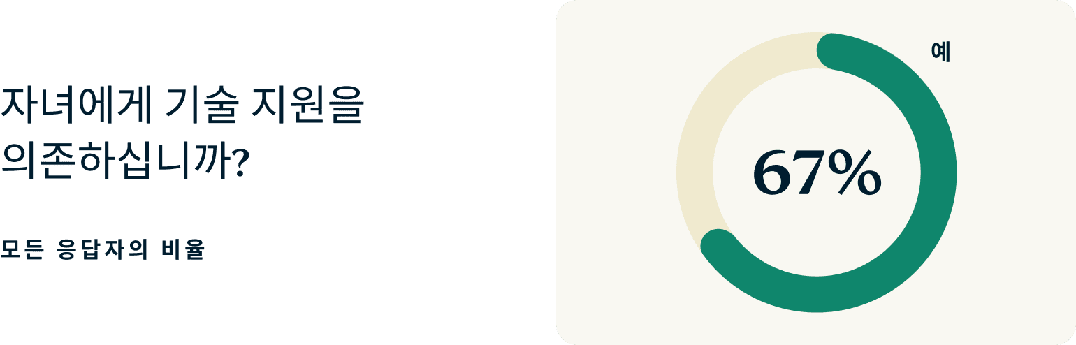 설문조사에 따르면, 많은 고령자가 기술 지원을 위해 가족에 의존하고 있습니다. X세대의 약 66%가 자녀의 도움을 필요로 하며, 이러한 필요성은 나이가 들수록 증가합니다. 베이비부머의 경우 그 숫자는 69%로 증가하며, 나이 든 베이비부머의 경우 71%까지 증가합니다.