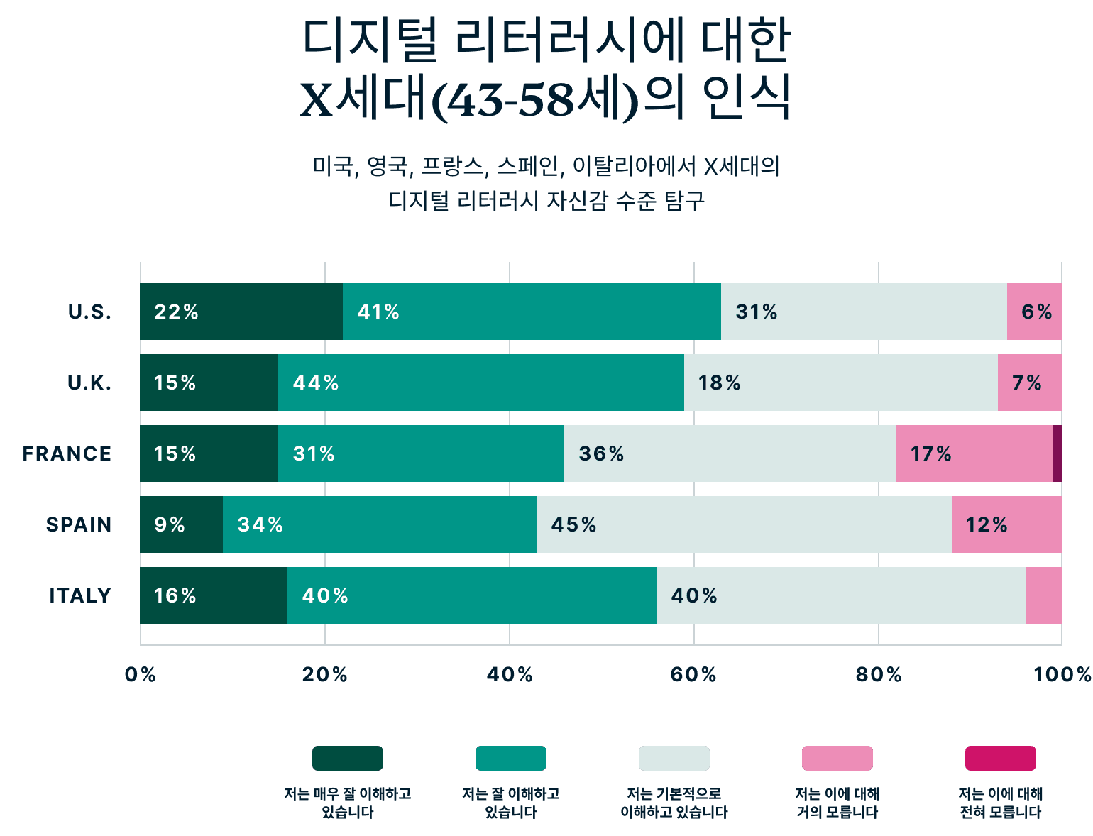 기술을 이해하는 데 있어 모든 세대나 국가가 같은 입장에 있는 것은 아닙니다. 설문조사 결과는 디지털 문맹률이 얼마나 다양한지, 그리고 기술을 다루는 데 있어 일부 세대가 다른 세대보다 얼마나 더 자신감을 느끼는지를 보여줍니다. 그러나 세대를 넘어서서, 스페인 응답자가 현대 기술을 사용하는 데 있어 가장 자신감이 낮다는 것을 발견했습니다. 반면, 미국과 이탈리아에서는 디지털 문맹률이 상대적으로 높게 나타났습니다.
