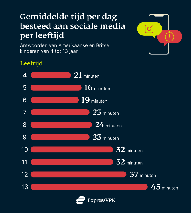 Aanzienlijk meer Amerikaanse (63%) dan Britse (53%) kinderen maken gebruik van sociale media. En deze kinderen brengen gemiddeld 28 minuten per dag door op sociale platforms.Het is niet verrassend dat kinderen meer tijd op socialmedia-websites doorbrengen naarmate ze ouder worden. Het gemiddelde van 45 minuten per dag voor 13-jarige Amerikaanse en Britse kinderen is niet zo verrassend, maar het feit dat vierjarigen die toegang hebben tot sociale platforms gemiddeld 21 minuten per dag aan sociale media besteden, is dat wel.