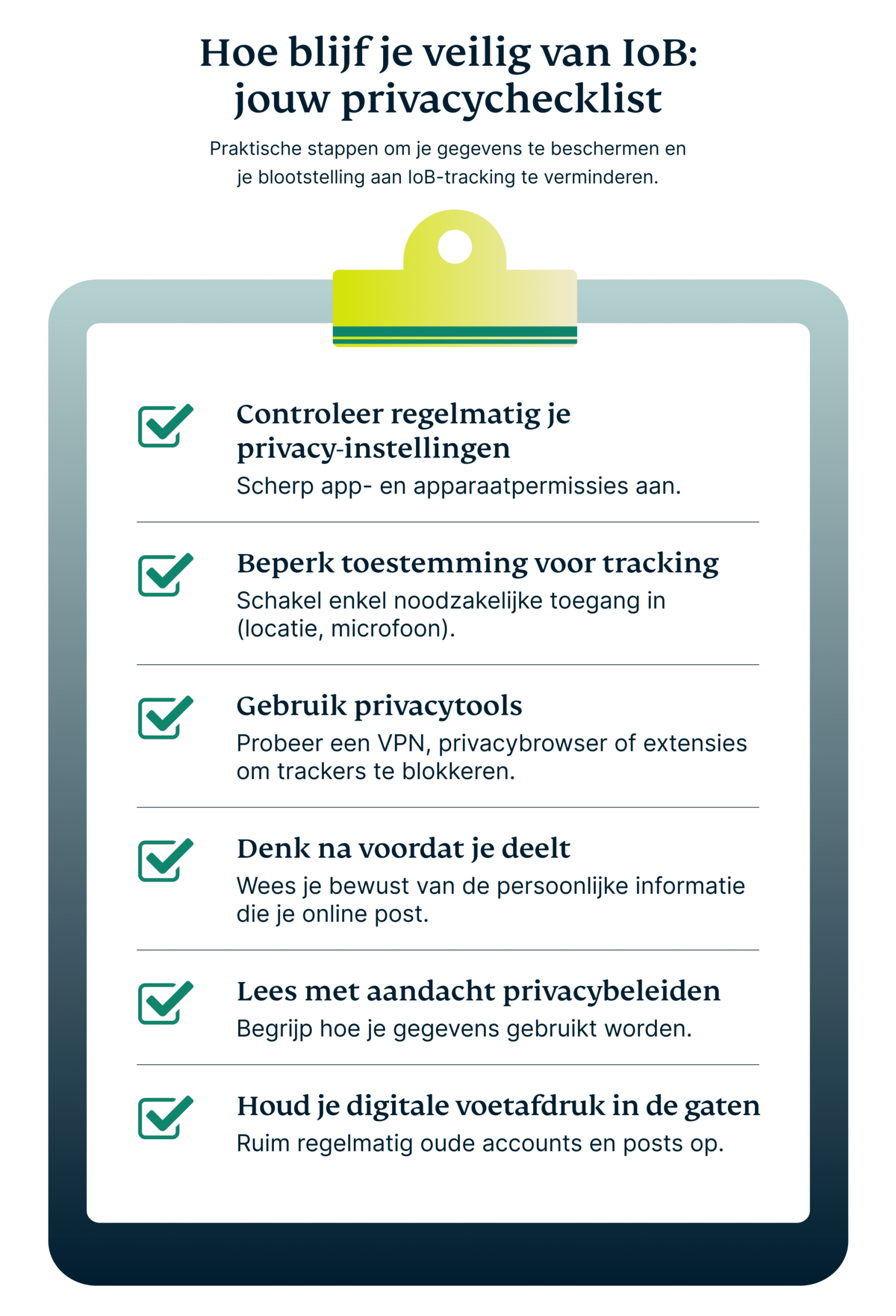 Hoewel het Internet of Behaviors allesomvattend lijkt, hoef je niet elke inbreuk op je persoonlijke gegevens te accepteren. Door proactief met je privacy om te gaan, kun je beperken hoeveel van je gedrag wordt gevolgd, verzameld en gebruikt. Zo kun je beginnen meer controle te nemen.