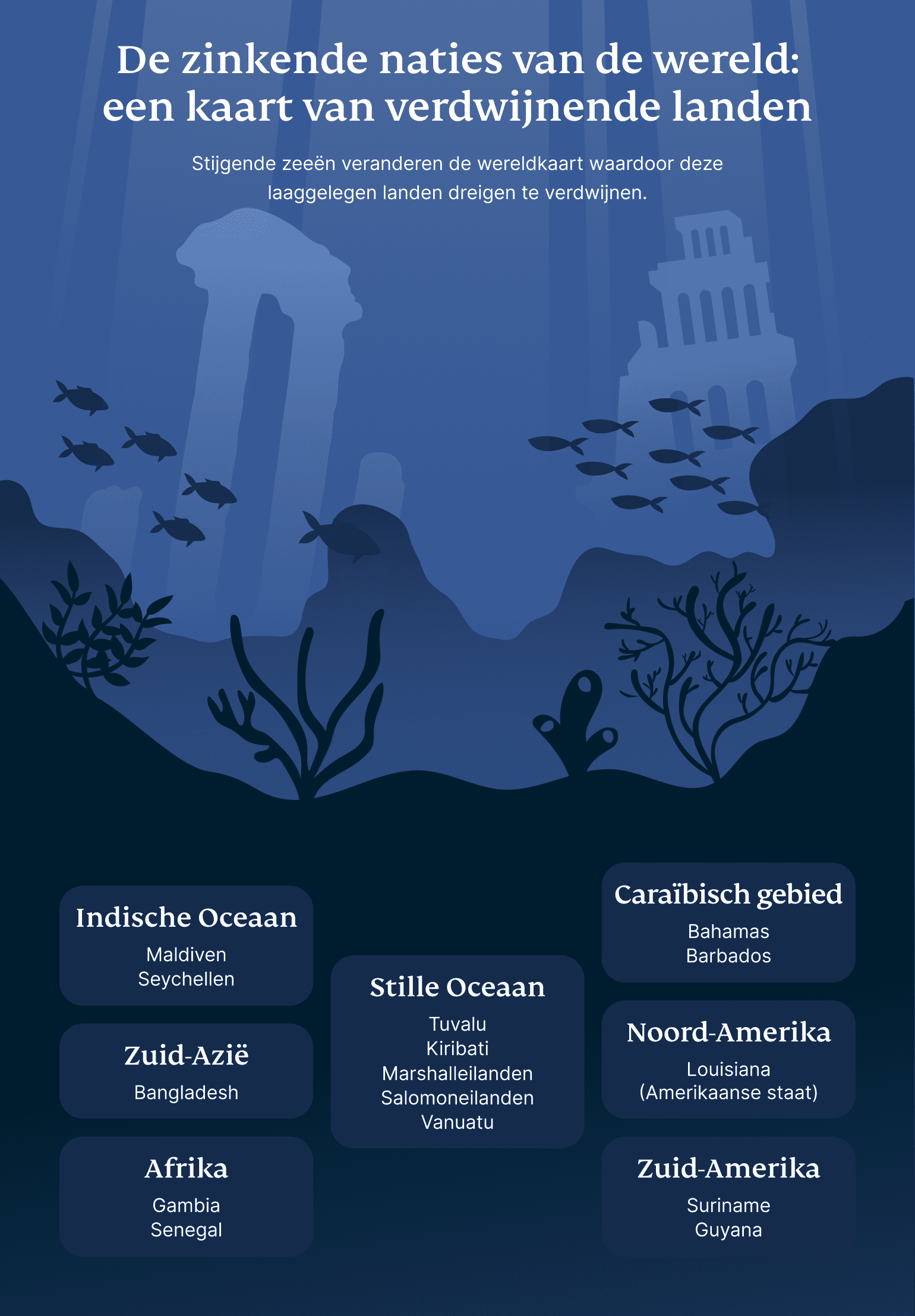 Voor veel kust- en eilandgebieden is de oceaan altijd een bron van leven geweest; het voedt economieën, vormt culturen en verbindt gemeenschappen. Maar nu dreigt het alles weg te nemen. Landen zoals Tuvalu, de Malediven en Kiribati behoren tot de meest kwetsbare landen. Maar ze zijn niet de enigen. Over de hele wereld worden laaggelegen gebieden—van atollen in de Stille en Indische Oceaan tot delen van Bangladesh en Louisiana—geconfronteerd met het risico om onder de golven te verdwijnen.