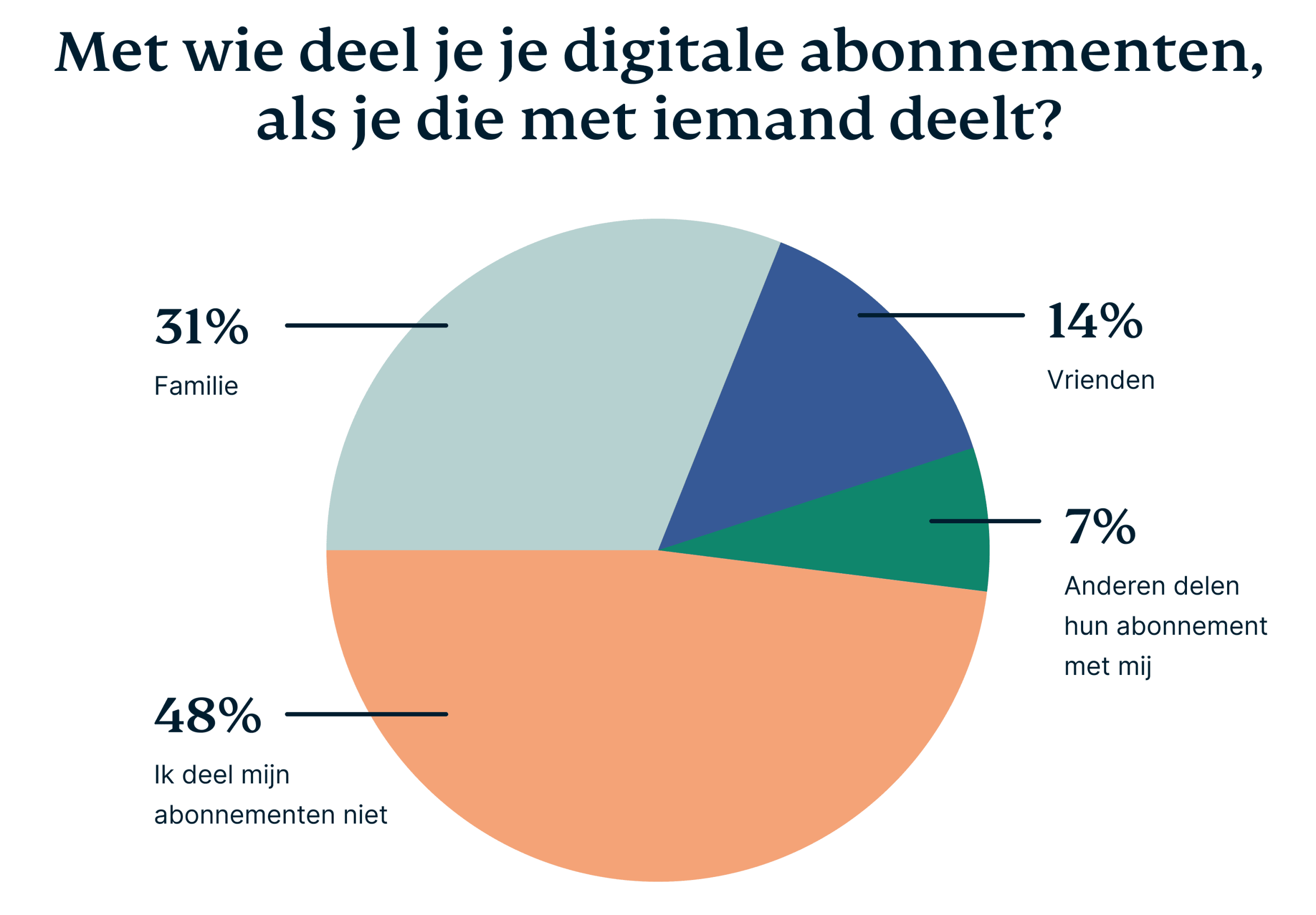 Volgens ons onderzoek deelt 31% van de mensen hun digitale abonnementen met familieleden, terwijl 14% deze delen met vrienden. Aan de andere kant gebruikt 7% van de respondenten abonnementen die door iemand anders worden betaald. Dit betekent dat bijna de helft van alle gebruikers betrokken is bij een vorm van het delen van abonnementen.