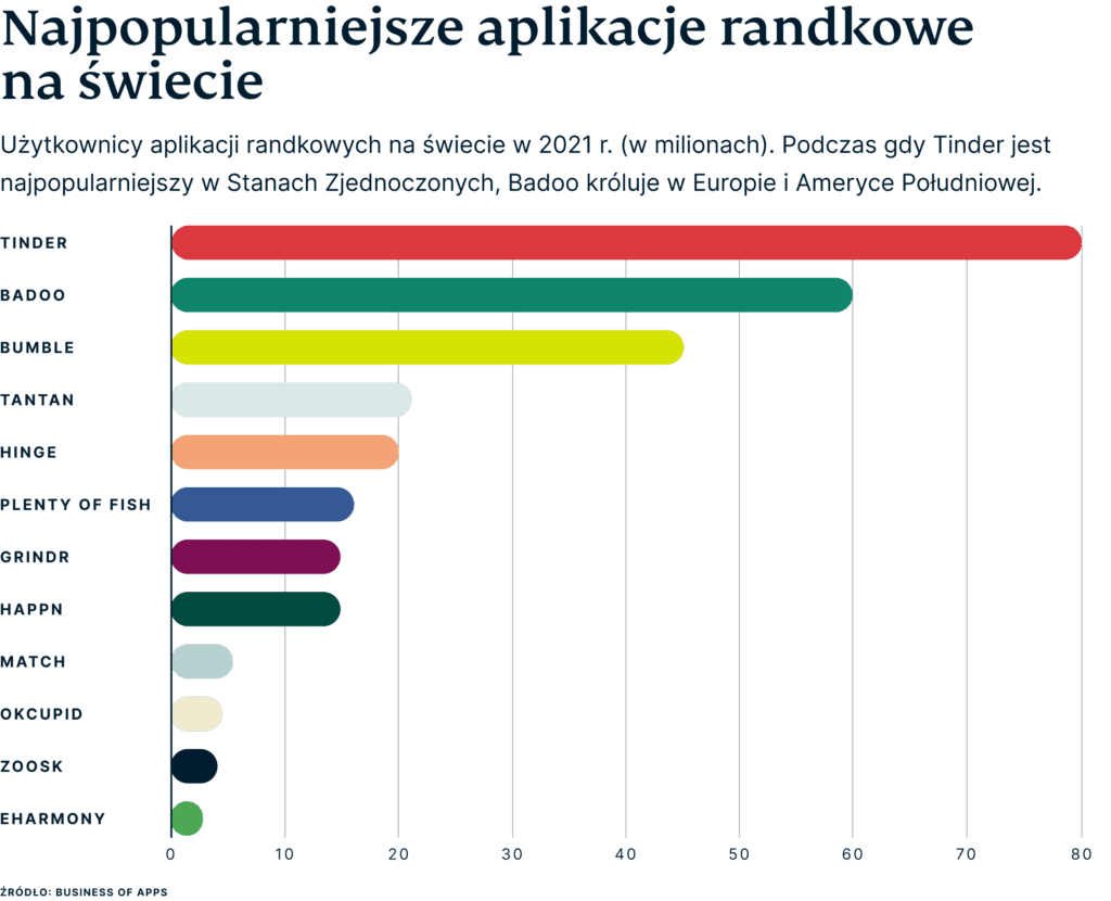 Globalnie, Tinder zachowuje pozycję najpopularniejszej aplikacji randkowej, a tuż za nim znajduje się brytyjska aplikacja Badoo. Bumble, który początkowo reklamował się jako aplikacja przyjazna dla kobiet, oraz chiński Tantan, zajęły kolejne miejsca.