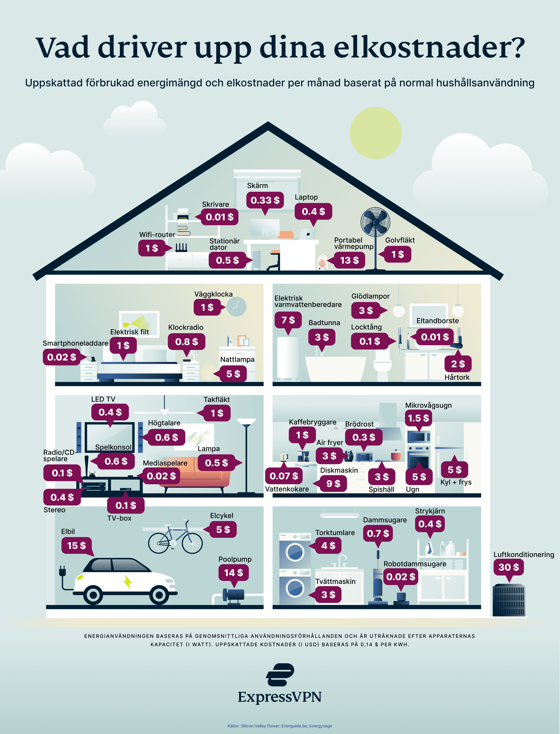 De flesta av oss vill dra vårt strå till stacken för miljöns skull och gärna sänka våra elkostnader på köpet. Det enklaste stället att börja är förmodligen den egna bostaden. Det kan vara bra att känna till vilka apparater som förbrukar mest elektricitet och kostar mest pengar. Föga förvånande visar våra data att bland annat luftkonditioneringsanläggningar och elektriska varmvattenberedare återfinns bland de största energislukarna med en månadsförbrukning på 216 kWh (30 USD) respektive 47 kWh (7 USD). Andra storförbrukare är poolpumpar (101 kWh; 14 USD) och elbilar som drar 110 kWh (15 USD) per laddning. Torktumlare och diskmaskiner drar även de upp kostnaderna med en förbrukning på 65 kWh (9 USD) respektive 26 kWh (4 USD) per månad.