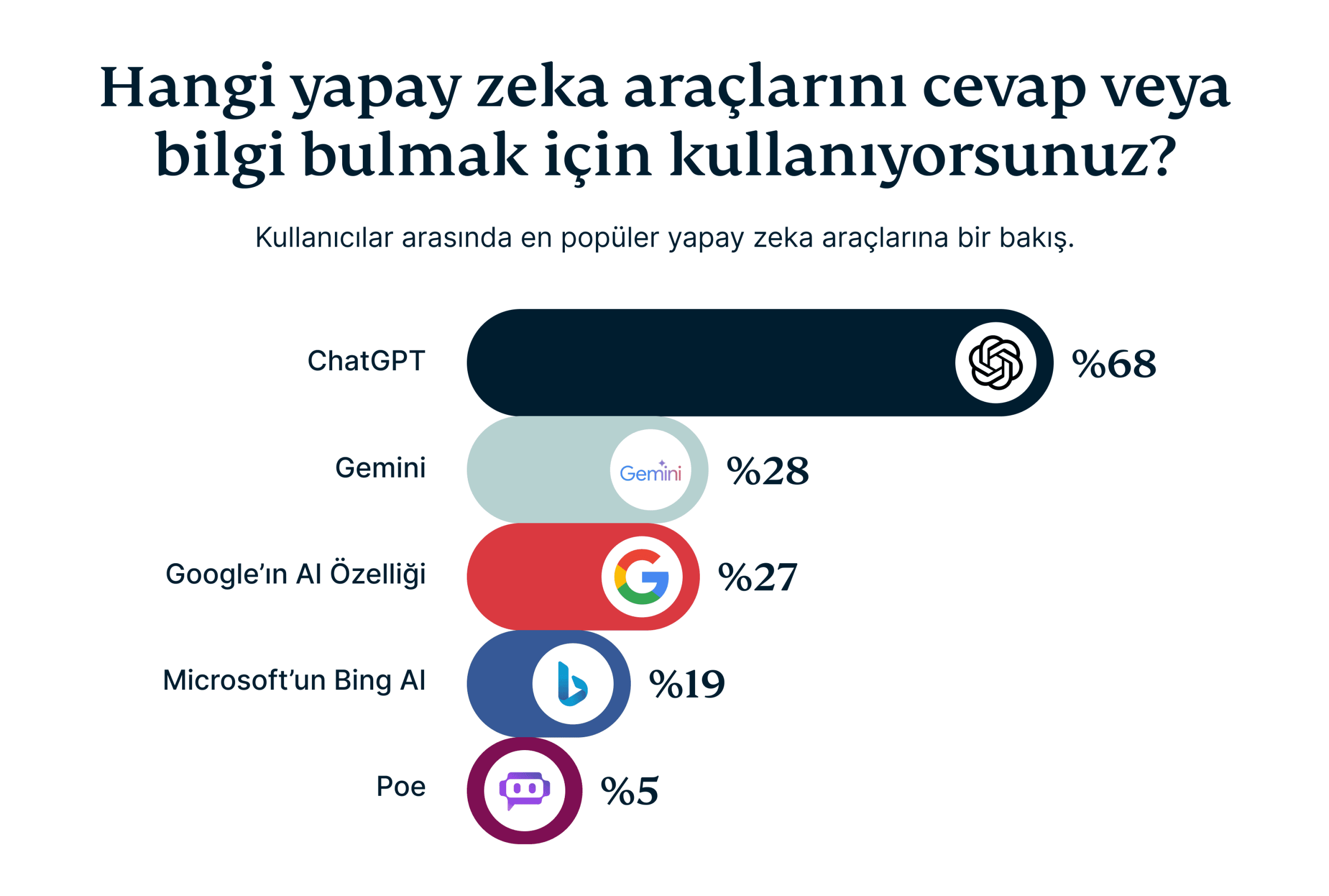 Yapay zeka araçları söz konusu olduğunda, ChatGPT açık ara favori. Kullanıcıların neredeyse %68’i sorularını yanıtlamak için ilk tercih olarak ChatGPT’yi gösterirken, rakipleri Gemini (%28) ve Bard (%27) daha geride kalıyor. ChatGPT’nin sohbet tarzındaki formatı ve derinlemesine yanıtlar sunma yeteneği, özellikle kişiselleştirilmiş ve ilgi çekici yanıtlar arayan genç kullanıcılar için öne çıkan bir araç haline geliyor.