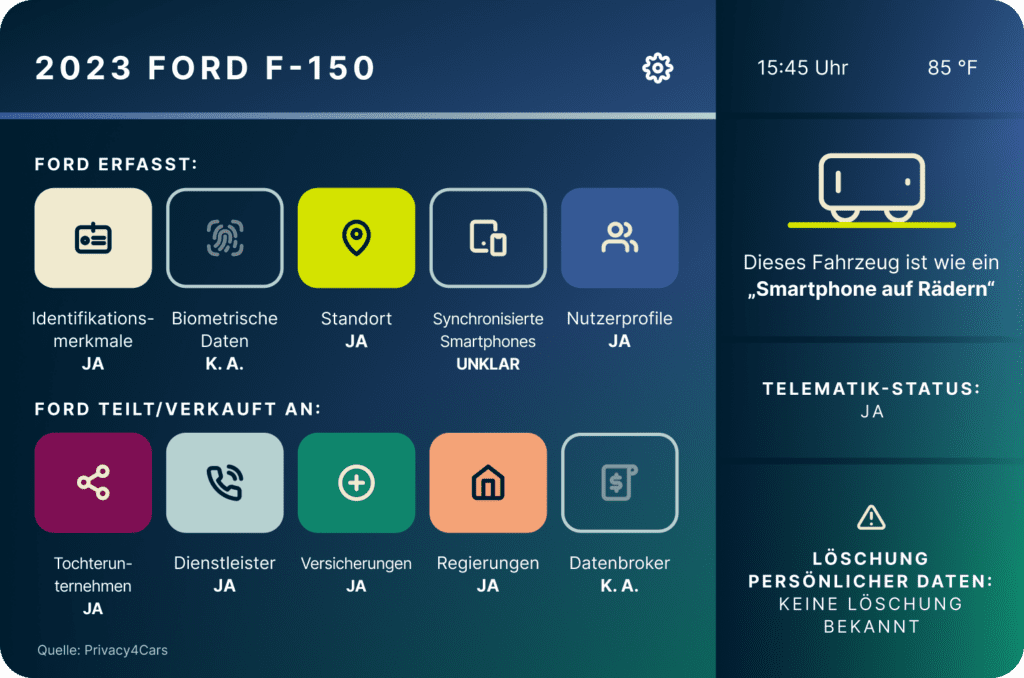 Diese Fahrzeughersteller erfassen eine Vielzahl von Daten über deren Fahrer und Beifahrer, einschließlich Standortdaten, Fahrgewohnheiten und sogar persönliche Daten wie Rasse sowie ethnische und religiöse Zugehörigkeit. Sie geben diese Daten außerdem an zahlreiche Drittanbieter wie Datenbroker, Strafverfolgungsbehörden und Versicherungen weiter.