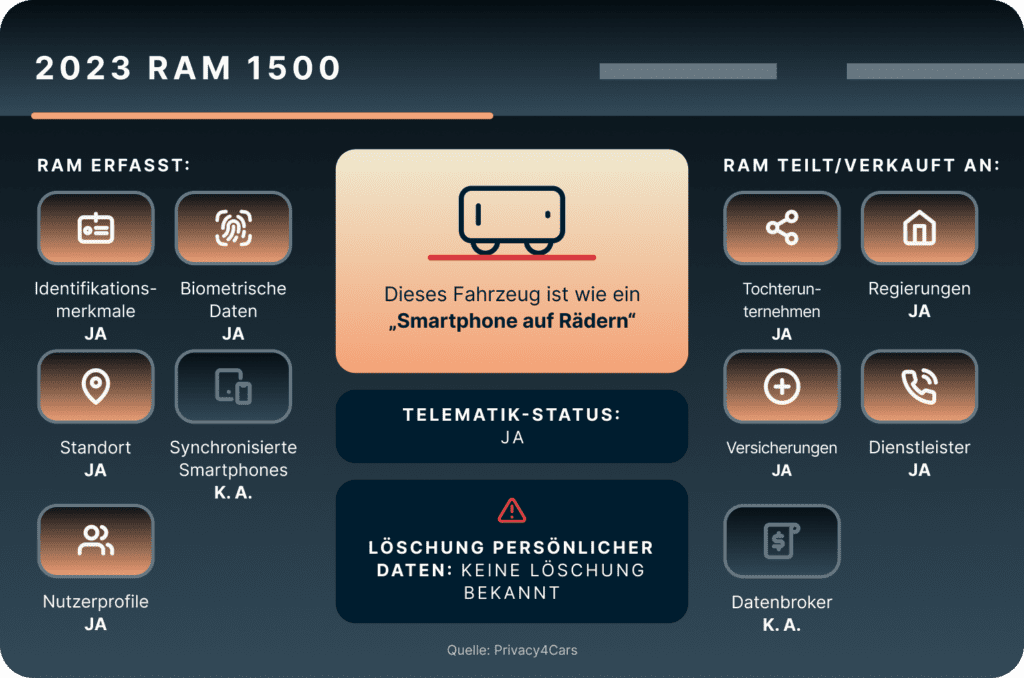 Beim Thema persönliche Daten wählt RAM „keine Löschung“, was persönliche Identifikationsmerkmale einschließt wie Namen und Adressen, Sozialversicherungsnummern und Führerscheindaten sowie biometrische Daten. RAM überwacht außerdem Fahrgewohnheiten und zeichnet Zeitstempel, Geschwindigkeit, Beschleunigung und Bremsverhalten auf. Das Fahrzeug trackt Standort, Wetter und gefahrene Strecken. Zudem behält es seinen eigenen Status im Auge und überwacht den Tank- und Batteriezustand sowie Kamerabilder.
