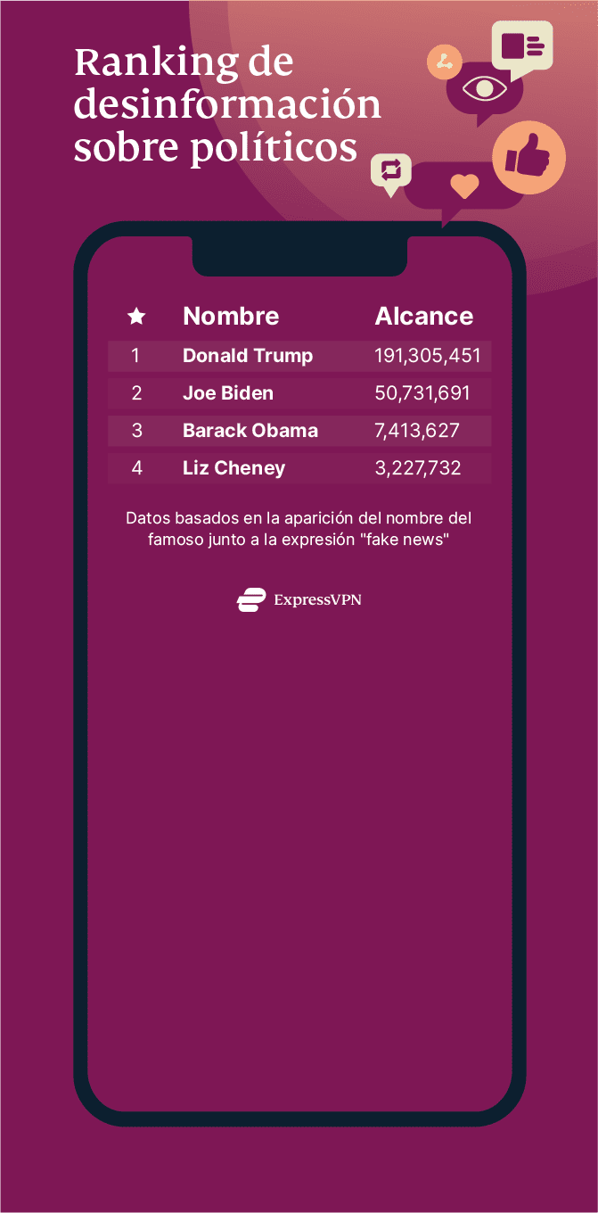 Probablemente haya sido Donald Trump quien popularizó el concepto de noticias falsas durante su presidencia, así que no debe sorprender que esté de primero en nuestra lista de políticos más asociados con el término. La investigación muestra que 191.305.451 personas se han topado con este tipo de publicaciones centradas en el expresidente.