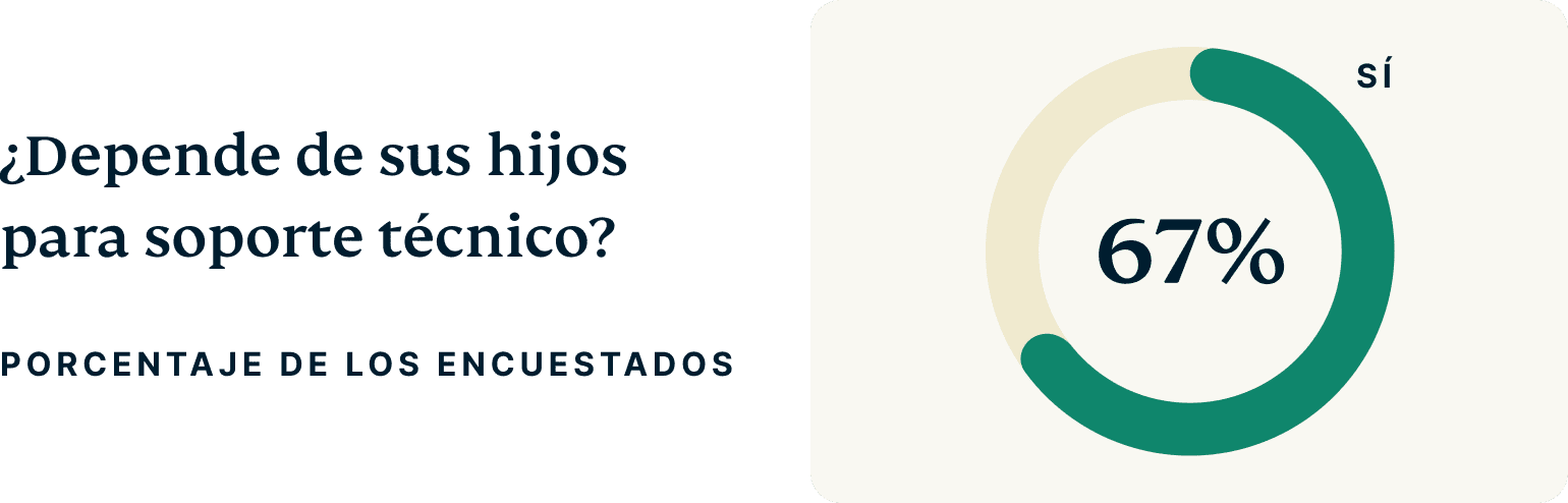 Nuestra encuesta demostró que muchos adultos mayores dependen de sus familias para soporte técnico. Alrededor del 66% de los encuestados de la Generación X dependen de sus hijos para obtener ayuda, y esta necesidad solo crece con la edad. Para los Baby Boomers, ese número sube al 69%, y para los Boomers mayores, es del 71%.