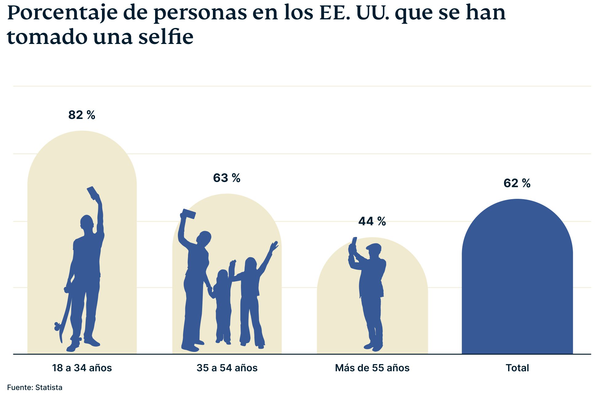 De hecho, las estadísticas de hace años revelan que el 62 % de los ciudadanos de los EE. UU. se han tomado una selfie en algún momento de sus vidas. El grupo más joven, de entre 18 y 34 años, fue el que más selfies realizó , con un 82 % habiéndose tomado al menos una.