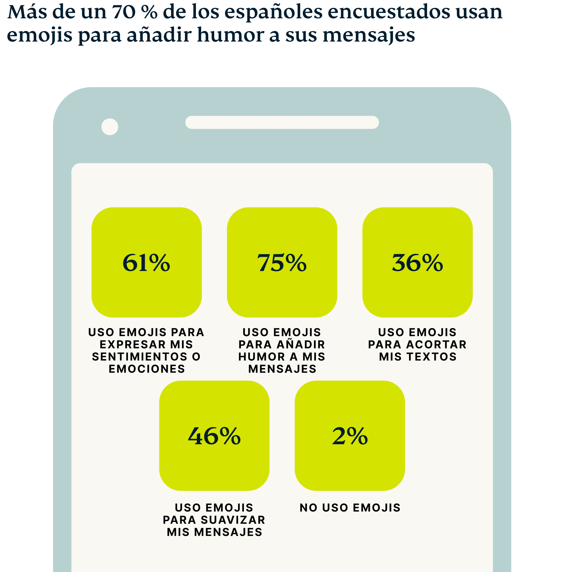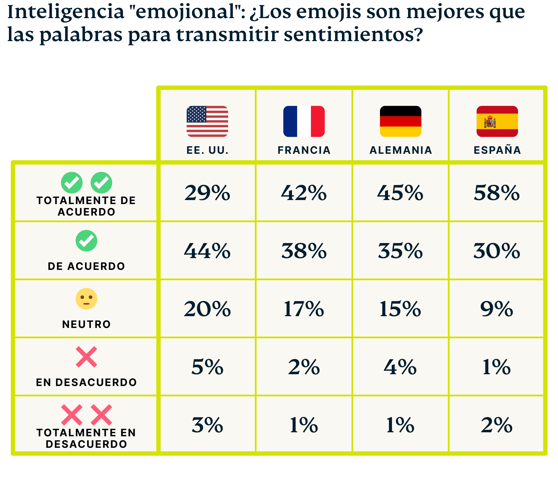 El 82 % de los españoles encuestados sí creen que las malas noticias pueden suavizarse utilizando emojis, lo cual contrasta con el dato de más de la mitad (51 %) de los estadounidenses encuestados, quienes no creen que los emojis mitiguen el impacto de las malas noticias.