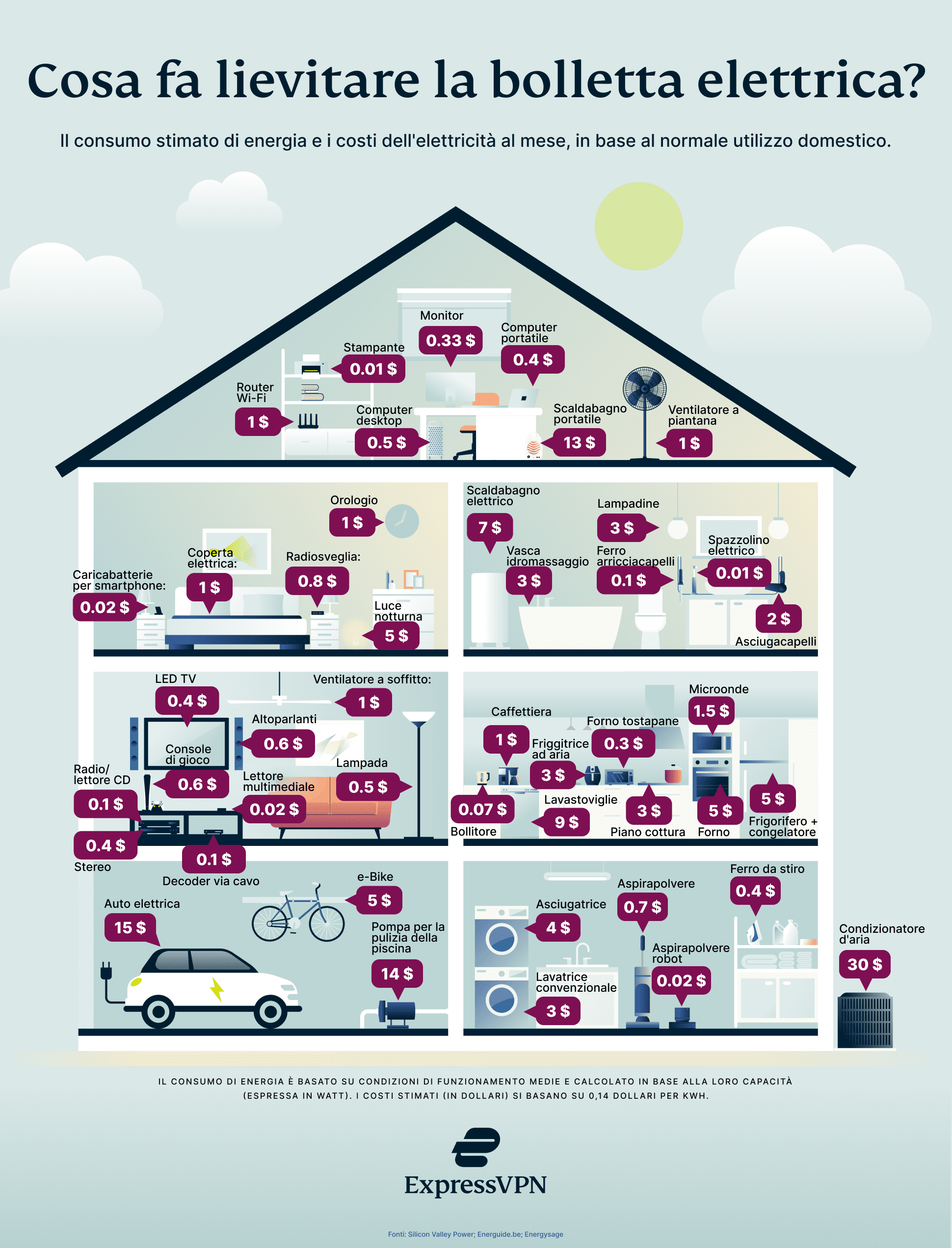 *L'energia utilizzata dalle apparecchiature domestiche, in condizioni di funzionamento medio, è calcolata in base alla loro capacità (espressa in watt) per ora e poi per mese. I costi stimati si basano su 0,14 $ per kWh, che è la media nazionale degli Stati Uniti. La frequenza e l'uso individuale possono variare.