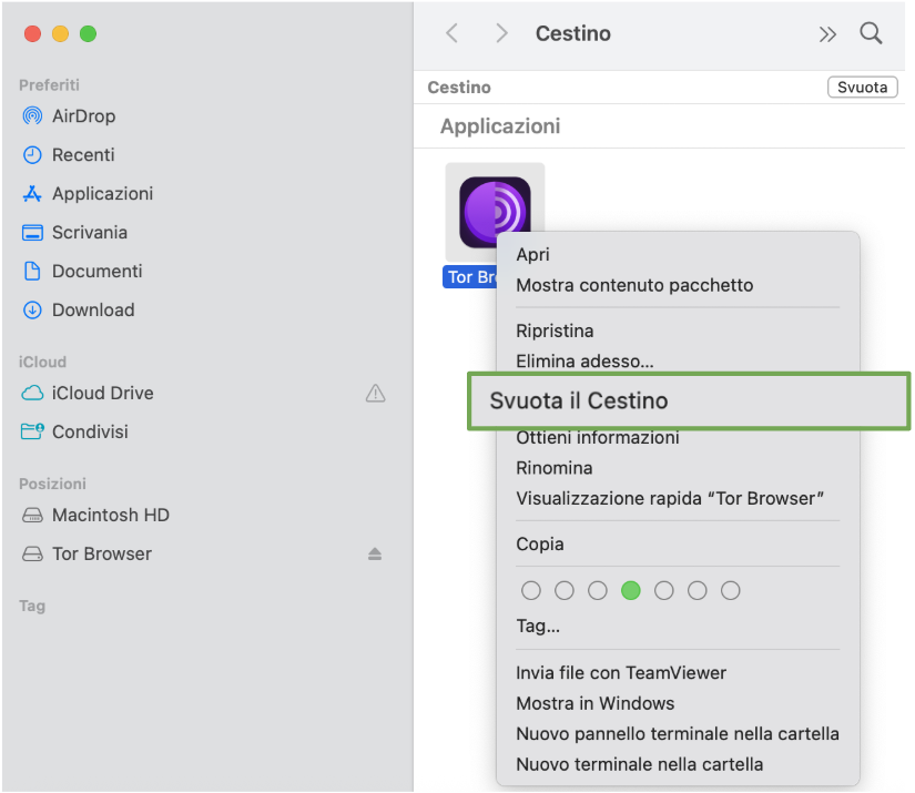 - Trova la cartella Tor Browser (di solito è sul Desktop), quindi clicca con il tasto destro del mouse e seleziona Elimina.