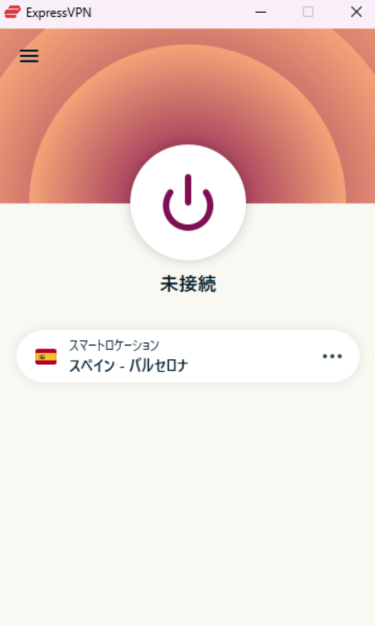 5. ExpressVPNのメイン画面が表示されます。中央に大きな電源ボタンがあります。