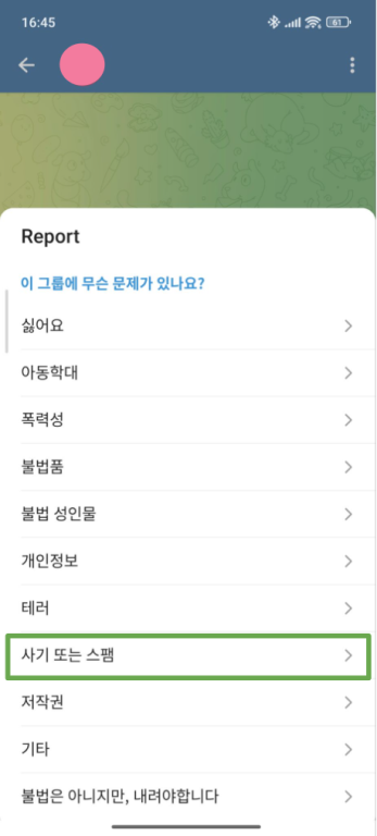 사기 사용자나 그룹을 신고하면 Telegram이 사기 계정을 찾아내고 차단하는 데 도움이 됩니다..