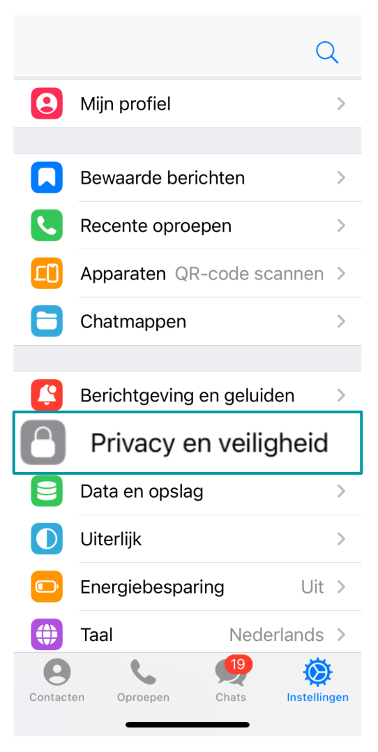 2. Tik op Privacy en Beveiliging. Hier kun je bepalen wie je telefoonnummer, profielfoto en laatst gezien-status kan zien. Door de toegang te beperken tot 'Mijn contacten' in plaats van 'Iedereen', kun je je persoonlijke gegevens privé houden.