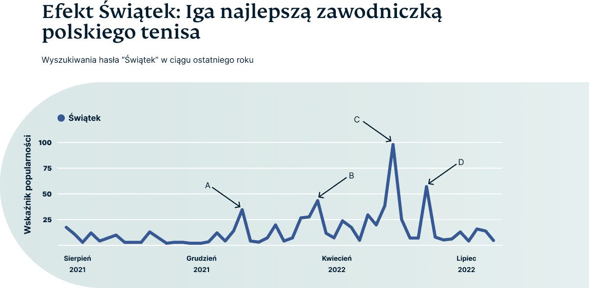 Inne ważne daty to zwycięstwo Igi Świątek w finale turnieju Roland Garros 2022, po raz drugi z rzędu (4 czerwca 2022, C). W tym samym czasie odbywały się również wzbudzające ogromne zainteresowanie mecze Polski w fazie grupowej Ligi Narodów. W drugiej połowie 2021 roku najwięcej wyszukiwań nastąpiło 8 września 2021, gdy Polska zremisowała z Anglią 1:1 podczas Eliminacji do Mistrzostw Świata (A). W ostatnim czasie uwagę przyciągnęły Mistrzostwa Świata Atletyki, podczas których w dniach 15 - 24 lipca Polacy zdobyli aż 4 medale.