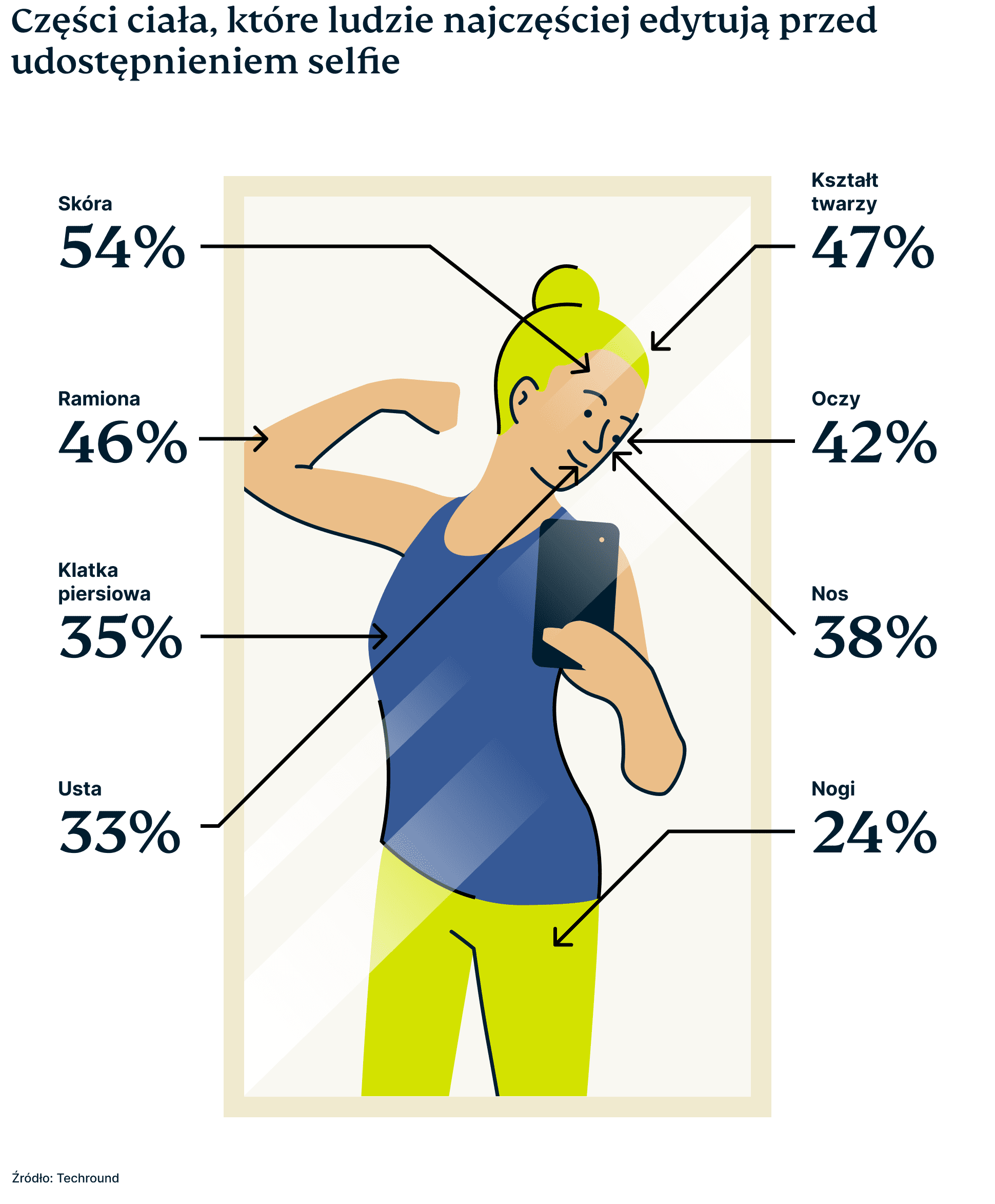 Spośród osób, które edytują swoje selfie, około 8% używa do tego Instagrama, a dwie trzecie korzysta z aplikacji Facetune. Robią to, aby ukryć niedoskonałości skóry i zmienić rysy twarzy.
