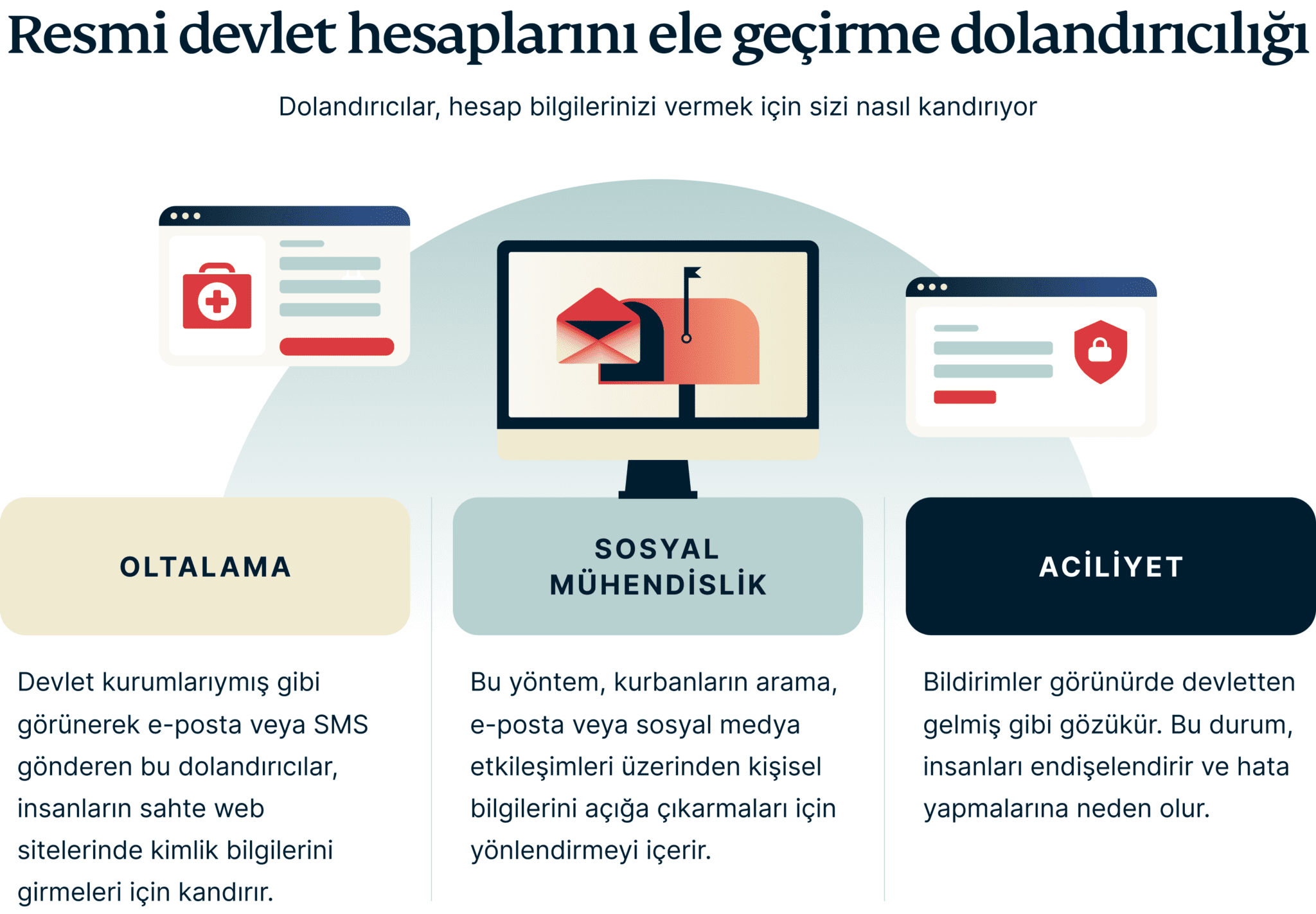 - İhtiyat çok önemli: Devlet kurumlarından beklenmedik bir şekilde gelen, özellikle de hassas bilgileri talep eden veya hızlı eylem isteyen iletişimlerde her zaman dikkatli olun. Birçok dolandırıcı, kullanıcının bilgilerini elde etmek için gerçekmiş gibi görünen oltalama e-postası kullanıyor. Bu tür mesajların gerçekliğini resmi devlet web sitelerini ziyaret ederek veya bilinen, sağlıklı kanallardan kurum ile iletişime geçerek doğrulayın.
